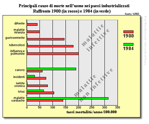 Eppure la performance della medicina nei paesi industrializzati è stata molto buona. I dati raccolti dalla Organizzazione Mondiale della Sanità (OMS/WHO), indicano che, prendendo come riferimento il numero di morti per 100.000 persone per anno per alcune forme morbose nel 1900 e nel 1984 - nel diagramma, le barre rosse forniscono i valori osservati nel 1900, quelle verdi i valori del 1984 - mostrano che, per le malattie infettive, la frequenza di morti nel 1984 è pressoché inesistente. In altre parole, al giorno d’oggi, malattie infettive quali peste, vaiolo, colera, non contribuiscono ai valori del grafico in quanto già ai primi del '900 non rappresentavano più un problema, ed altre malattie infettive (tubercolosi, influenza, polmonite, difterite, gastroenteriti infettive e tutte le malattie dell'infanzia) sono notevolmente diminuite, almeno nei paesi industrializzati cui il diagramma si riferisce. Diversa è la situazione in paesi meno sviluppati: infatti, le malattie infettive ancora causano annualmente nel mondo quasi 20 milioni di morti, cioè oltre 1/3 di tutti i decessi.