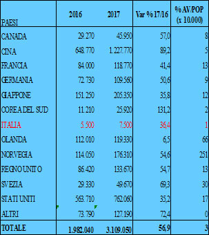 Anche analizzando la consistenza del parco autovetture, questa risulta essere in deciso aumento in tutti i paesi con variazioni che vanno dal 6% circa dell’Olanda al 131% circa della Corea del Sud. Il paese con il parco più ampio è la Cina, che già nel 2016 ha superato gli USA e nel 2017 ha raggiunto e oltrepassato il milione di unità. Purtroppo l’Italia, nonostante un buon incremento del 36% tra i due anni, rimane in coda rapportando il numero di autovetture alla popolazione: solo 1 autovettura ogni 10.000 abitanti. La Norvegia è nettamente in testa con un valore dell’indice pari a 251.