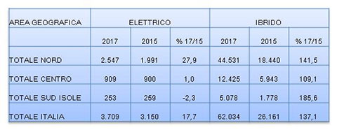 Volendo approfondire e vedere cosa succede a livello di area geografica, appare chiaro come lo sviluppo dei due settori sia diverso. Infatti nell’elettrico il nord Italia ha incrementato del 28% circa i numeri rispetto al 2015, il centro li ha mantenuti praticamente costanti ed infine il sud ha visto una contrazione, sebbene limitata (-2% circa). Andamento opposto per quanto riguarda l’ibrido, dove proprio il sud Italia ha avuto un incremento maggiore negli ultimi 2 anni (+ 186 % circa); segue il nord (+ 141% circa) e infine il centro con “solo” il 109%.
