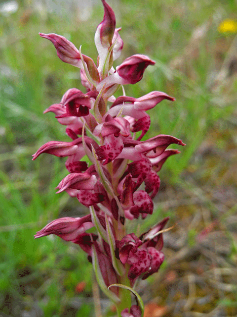 Anacamptis coriophora (L.) R.M.Bateman, Pridgeon & M.W. Chase 1997. Pianta erbacea geofita bulbosa, con fusto alto da 10 a 40 cm, verde alla base, tendente al porpora verso l'apice. Il nome coriofora deriva dal greco κορίς = "cimice" e φορός = "che porta", cioè portatrice di cimici, per l'odore sgradevole del fiore.