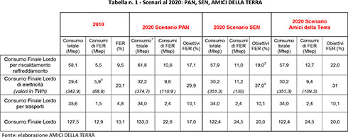 Tabella n 1 - Scenari al 2020: PAN, SEN, Amici della Terra