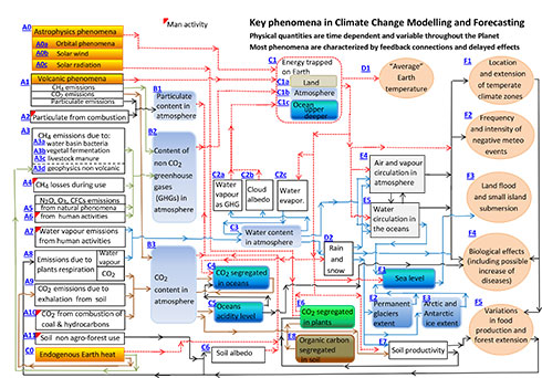 Per parte mia (confesso, sono un fisico), ho pubblicato uno schema indicativo di cause ed effetti (tra loro intrecciati da decisivi meccanismi di feedback) dei Cambiamenti Climatici, pur consapevole dei suoi limiti, per dare almeno un'idea della innegabile complessità dei fenomeni di cui tener conto e delle mutue interazioni, per non parlare dell'incertezza su alcuni aspetti decisivi.