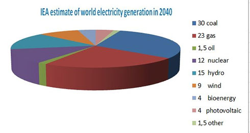 A Parigi i grandi della Terra hanno proclamato il loro impegno per un obiettivo ambizioso: contenere entro 2° C, (anzi, più ambiziosamente -direi eroicamente- entro 1,5 °C) la crescita della ostile divinità dei nostri giorni, la fantomatica “temperatura media del pianeta" grandezza convenzionale sul cui significato gravano dubbi sostanziali. Poco o niente ci hanno detto sulle azioni da mettere in atto allo scopo, se non invitare i singoli paesi a procedere nella loro autonomia con i programmi nazionali non vincolati da ciascuno comunicati. Proviamo a vedere cosa, secondo un recentissimo Rapporto dell’Agenzia Internazionale dell’Energia di Parigi (Battiato ha trovato finalmente il Centro di gravità permanente) può succedere a livello di uso delle fonti alla data del 2040, cioè tra un quarto di secolo, relativamente a un segmento del settore energia, quello della produzione dell'energia elettrica. La torta rappresentata ci dà una serie di informazioni: i combustibili fossili saranno ancora la fonte prevalente (anche se di poco) con il 54,5 % seguiti da rinnovabili con 32 % e dal nucleare con 12 %.Uno scenario poco rassicurante (ancora peggiore se teniamo conto del petrolio da consumare per i trasporti) se fossero fondate le fosche previsioni, alla base dei lavori della COP21, che attribuiscono all'accumulo di CO2 nell'atmosfera disastrosi aumenti della temperatura del pianeta.
