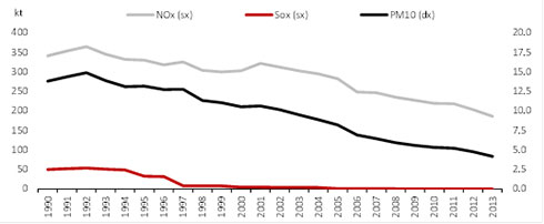 Le politiche basate sugli standard dei combustibili hanno conseguito successi rilevanti con la totale eliminazione del piombo a partire dagli anni 2000 e la fortissima riduzione delle emissioni di SOx che, per i veicoli pesanti, sono passate da 50 kt nel 1990 a 0.1 kt nel 2013 (Figura 2).